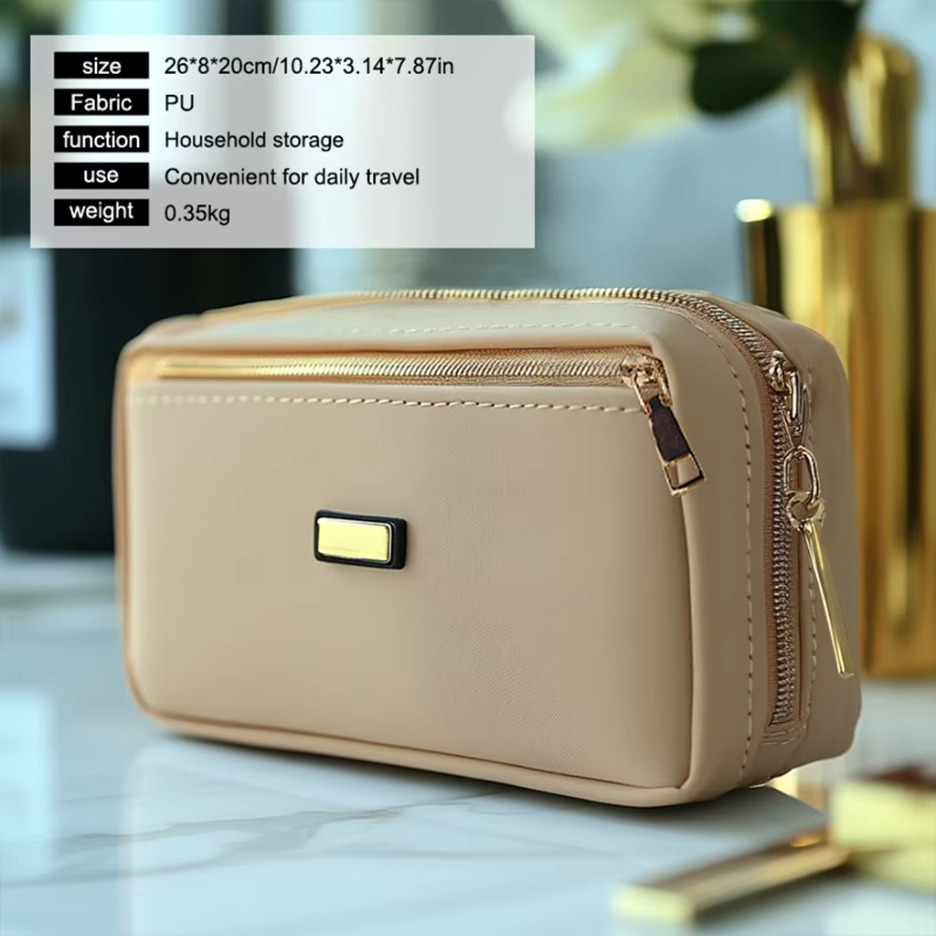 Sa taille compacte garantit qu'il peut être placé facilement sur l'étagère de votre salle de bain, sur la table de vanité ou même glissé dans un tiroir lorsqu'il n'est pas utilisé. Le système de fermeture sécurisé permet de garder tout ce qui se trouve à l'intérieur protégé et organisé, faisant de ce sac un choix pratique pour l'organisation quotidienne du ménage.