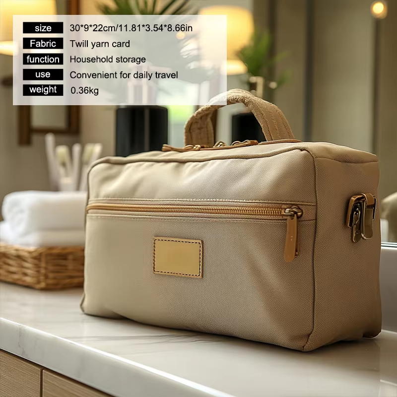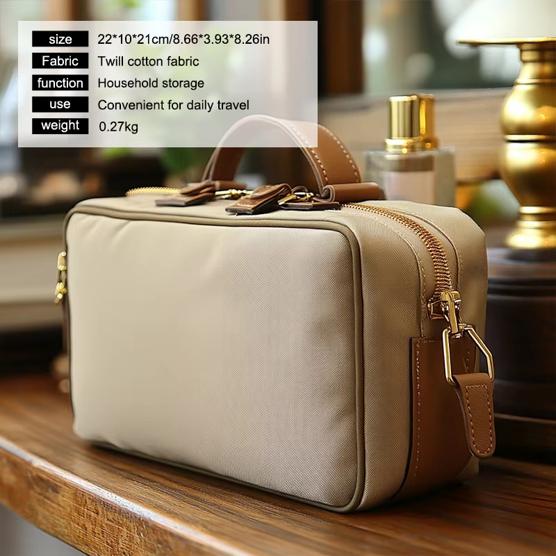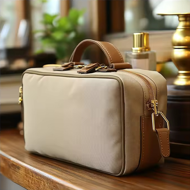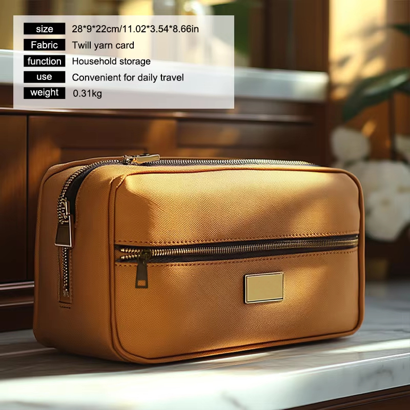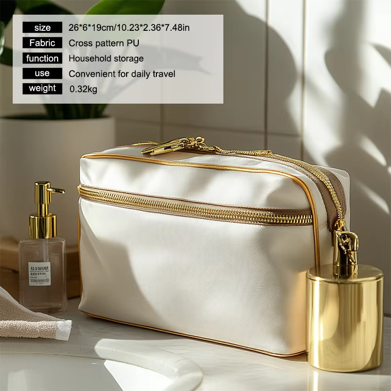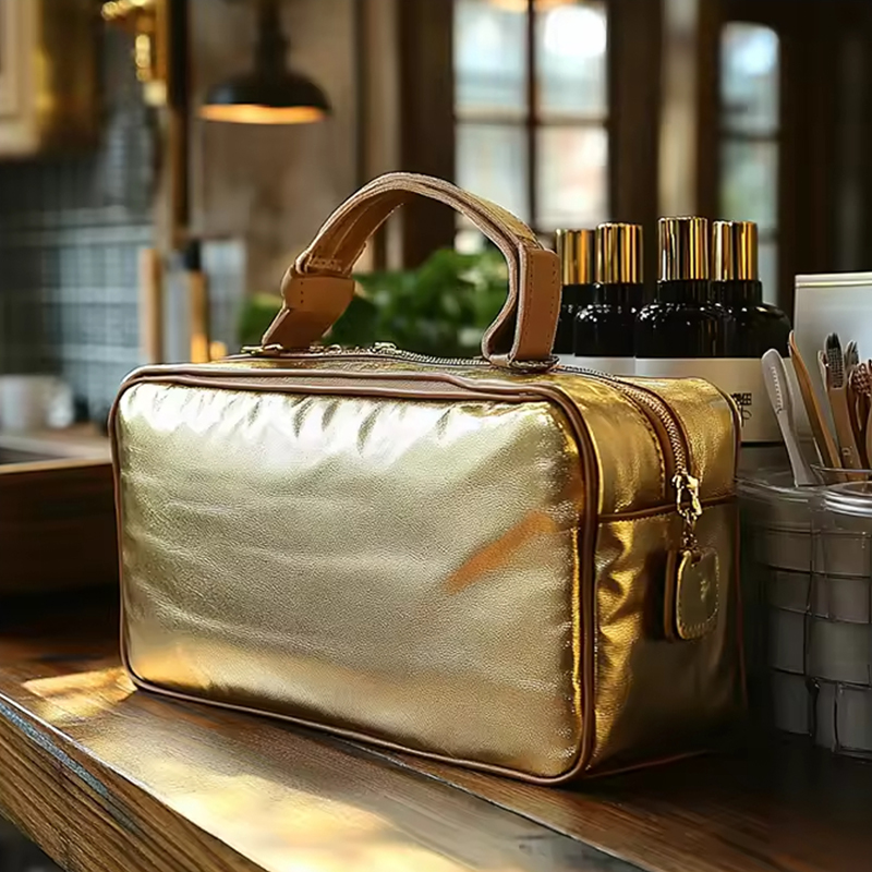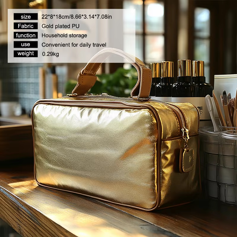 Le tissu PU plaqué or utilisé dans cette trousse à cosmétiques est non seulement visuellement attrayant, mais également durable et facile à entretenir. La finition dorée ajoute une touche d'élégance, ce qui en fait plus qu'un simple article fonctionnel—c'est aussi une pièce maîtresse. Le cuir PU de haute qualité est doux au toucher, tandis que le placage doré garantit que le sac se démarque dans votre collection d'essentiels de voyage.