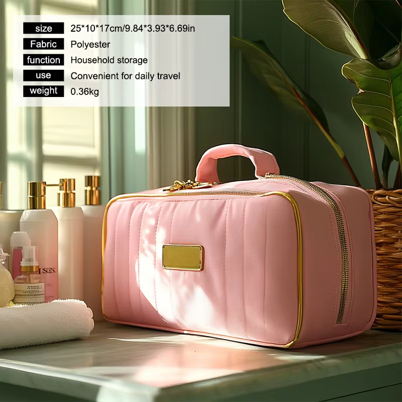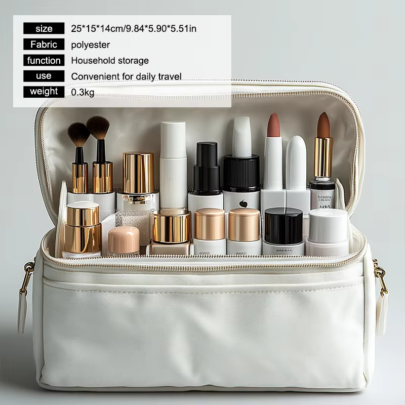 En plus de ses fonctionnalités adaptées aux voyages, la trousse de rangement en polyester est également un bon choix pour le rangement domestique. Gardez-le dans votre salle de bain, votre coiffeuse ou votre dressing pour ranger vos cosmétiques de tous les jours, vos produits de soins de la peau ou même vos petits accessoires. Son design polyvalent le rend idéal pour tous ceux qui cherchent à garder leurs essentiels de beauté soigneusement organisés à la maison.