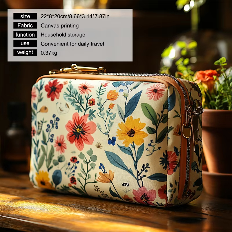Non seulement cette trousse à cosmétiques en toile imprimée est un excellent compagnon de voyage, mais elle excelle également dans le rangement domestique. Gardez-le dans votre salle de bain, votre chambre ou votre placard pour ranger les essentiels du quotidien comme le maquillage, les outils de toilettage ou même les petits accessoires. Son intérieur spacieux offre suffisamment d'espace pour tous vos articles, et la fermeture zippée garantit que rien ne tombe ou ne soit égaré. Le design simple mais élégant du sac le rend adapté à une large gamme d'utilisations et s'intègre parfaitement à divers styles de décoration intérieure.