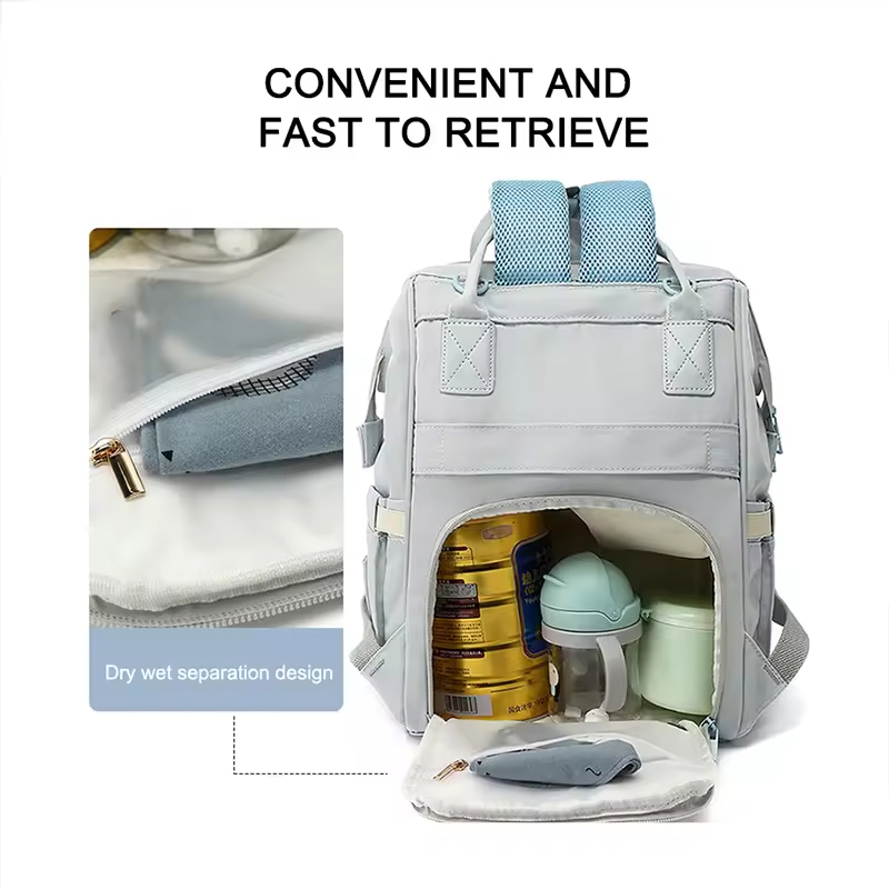 Le sac à langer de grande capacité avec table à langer n'est pas seulement un sac à langer—c'est une solution parentale complète. En plus des grands compartiments de rangement et de la table à langer rabattable, il comprend une poche isotherme intégrée pour garder les bouteilles au chaud ou au frais, un compartiment à vêtements mouillés et une poche avant facile d'accès pour les petits objets comme les clés ou les téléphones. Le sac est aussi fonctionnel que pratique, vous permettant de gérer les besoins de votre bébé sans perdre le rythme.